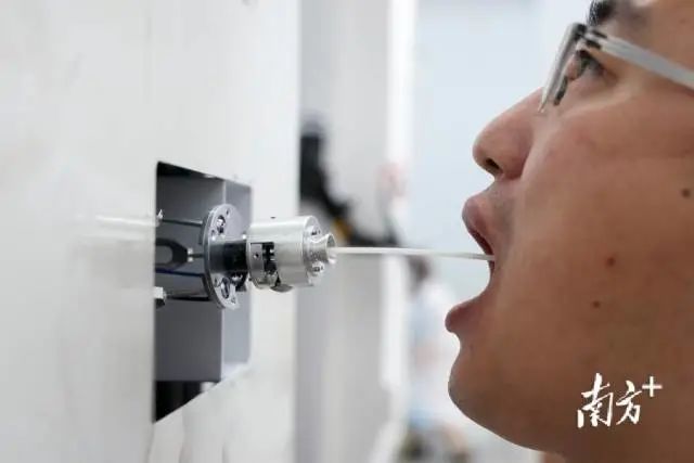 该智能核酸采样机器人是由一台机械臂和上方的采样装置组成,采样者将采样棉签插入采样装置的小洞中,按照语音提示即可一步步地完成采样流程。全程无需咬口器材等任何辅助工具,如果机器人识别到采样者的姿势不规范,会发出“请张大嘴巴”“请仰头”等提示,整个采样过程大约30秒。